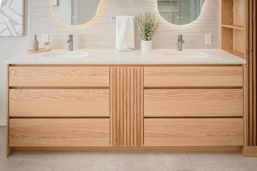 Cette salle de bain haut de gamme au design contemporain, où le chêne blanc naturel et les matériaux nobles créent une ambiance douce et apaisante.