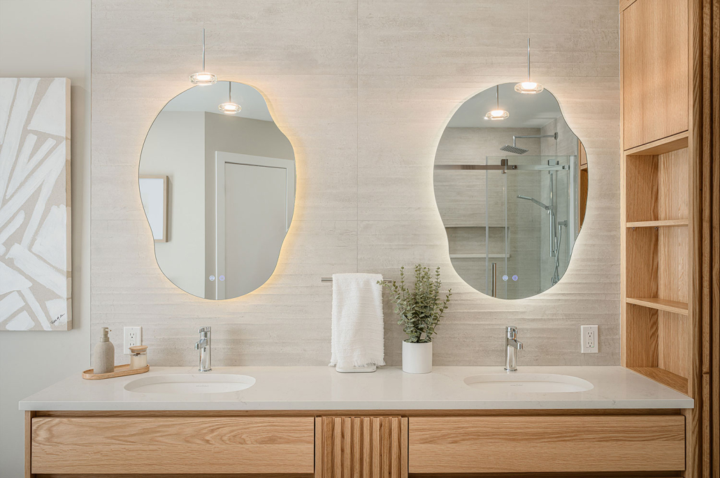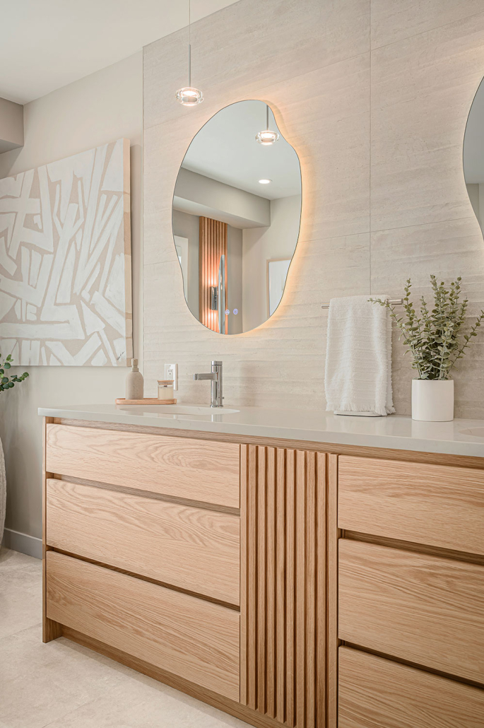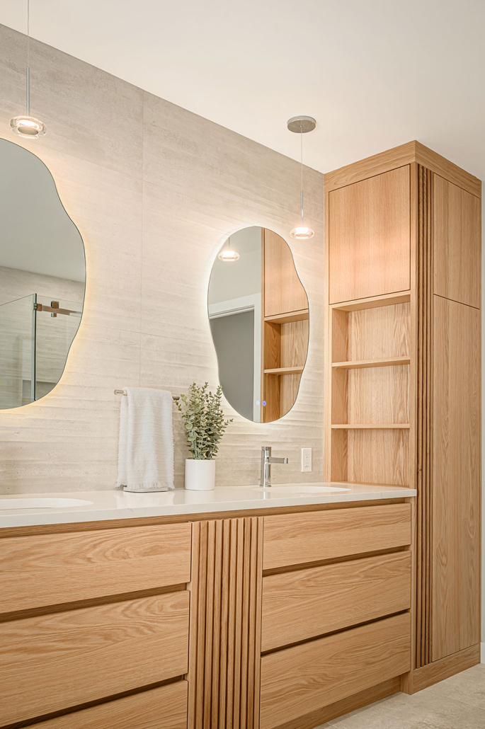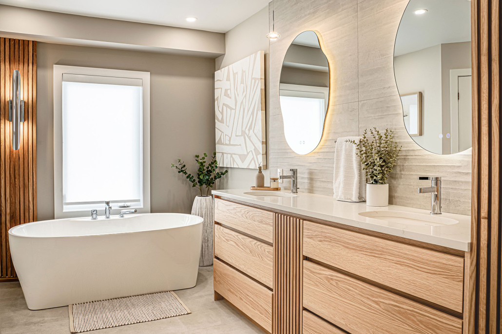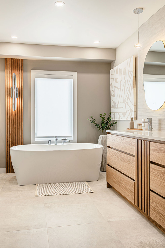 La vanité sur mesure, le miroir rétroéclairé et la baignoire autoportante renforcent un véritable effet spa à la maison, à la fois luxueux et enveloppant.