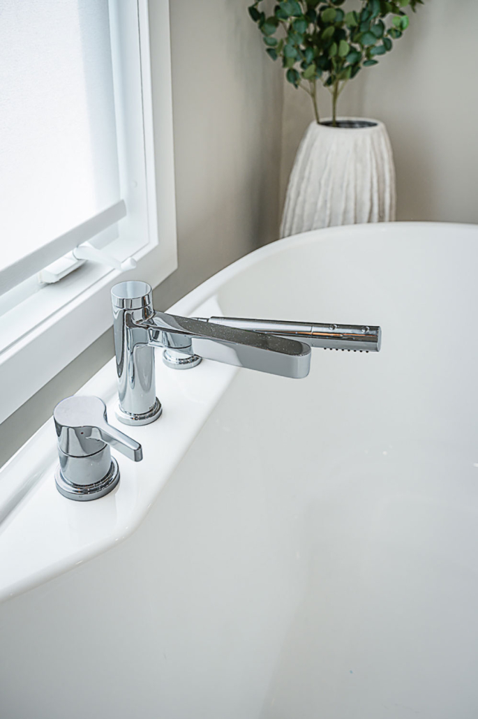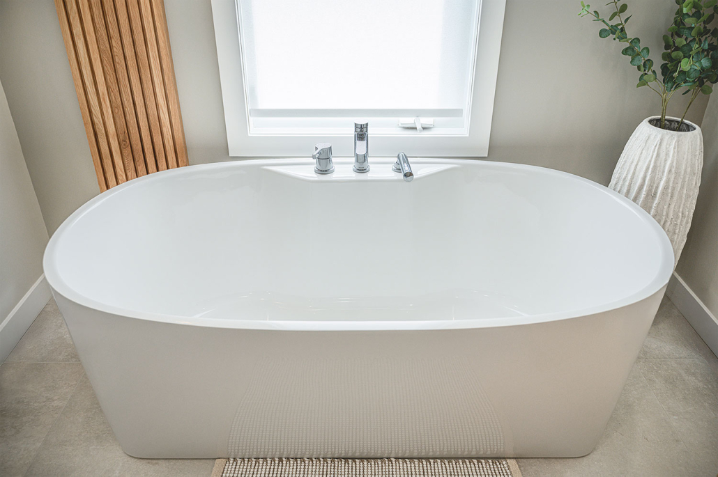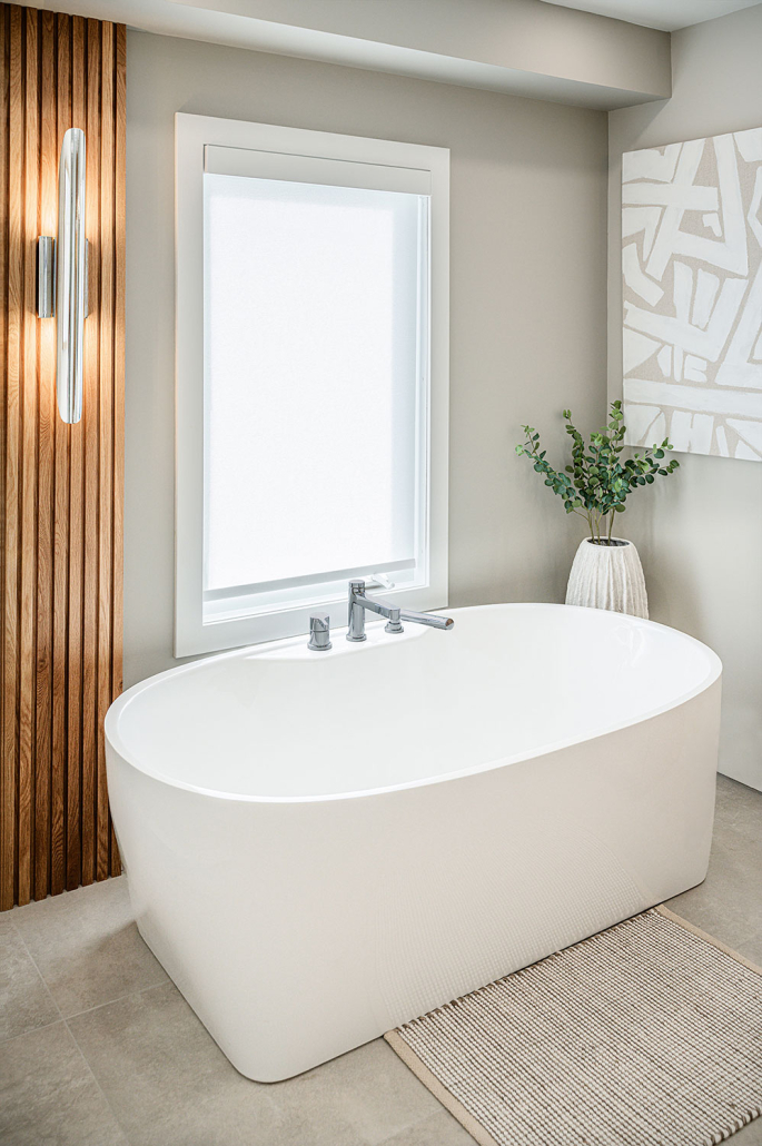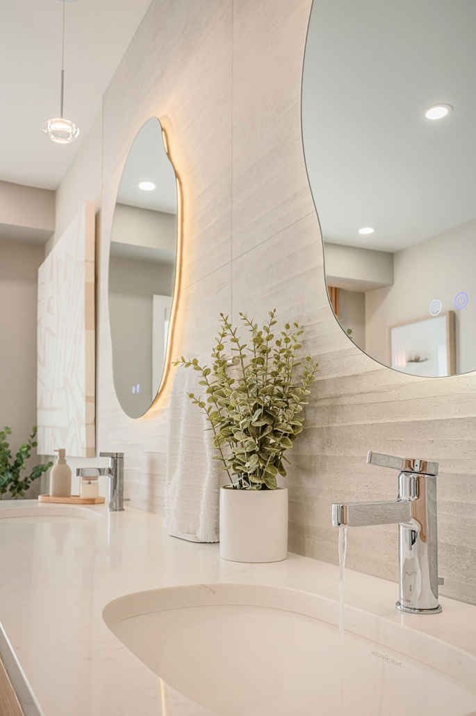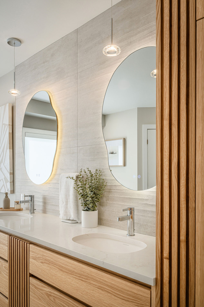 La vanité sur mesure, le miroir rétroéclairé et la baignoire autoportante renforcent un véritable effet spa à la maison, à la fois luxueux et enveloppant.